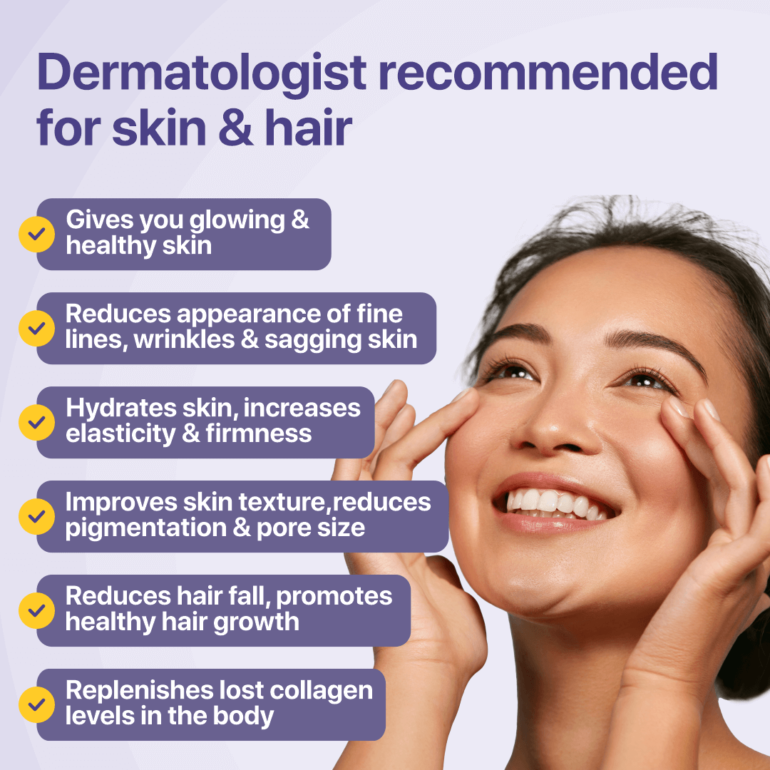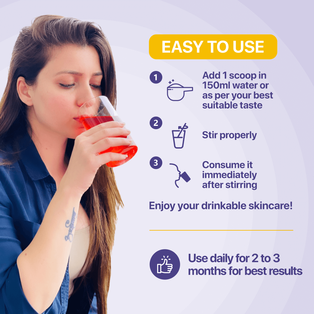 Collagen is the most abundant protein in our body which is vital in giving structure to our hair, skin, nails, bones, ligaments and tendons. It`s because of collagen, we are able to move, bend and stretch. Collagen supplement is the main protein responsible for hair shine, skin glow and helps nails to stay strong.