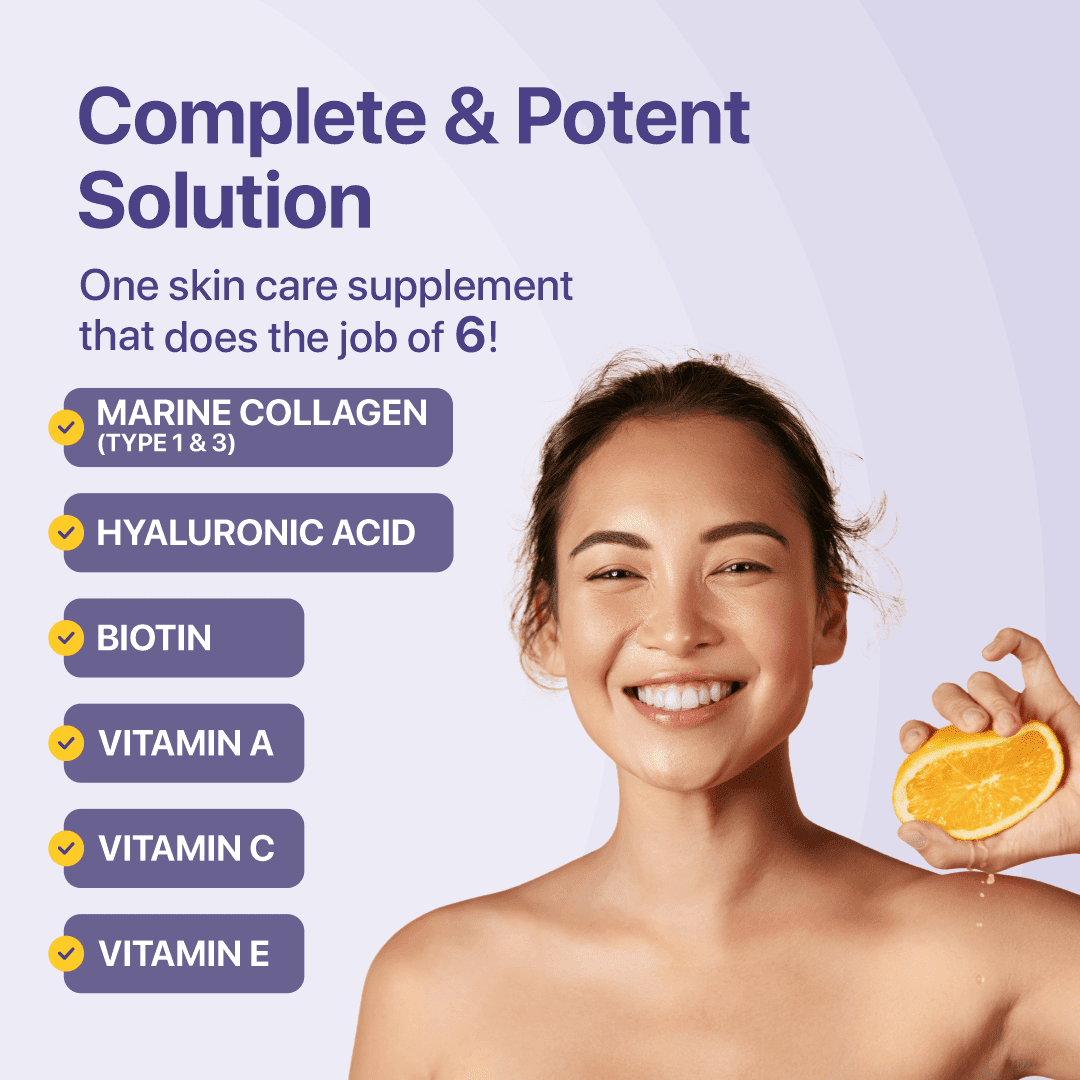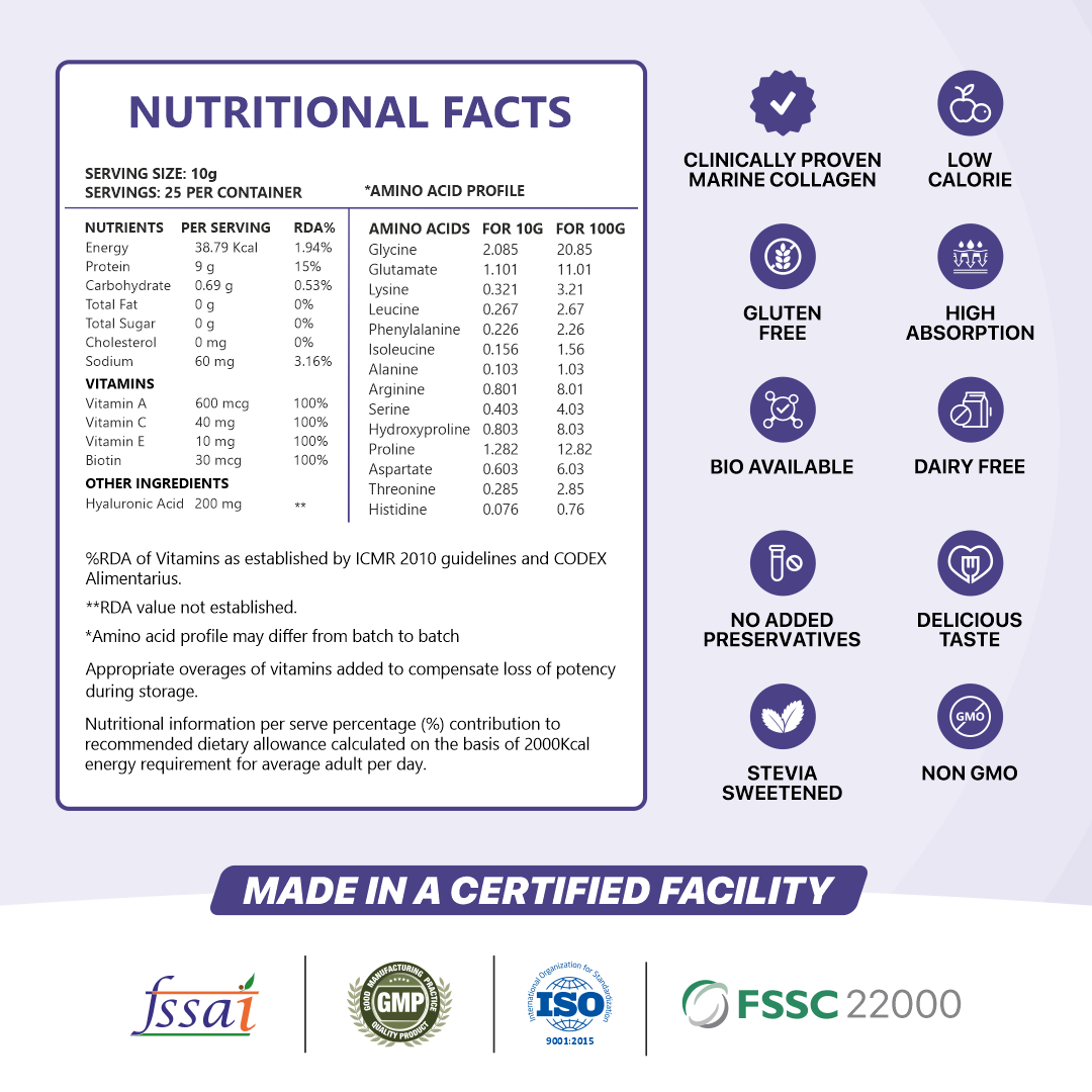 Collagen Skin Formula is a highly effective beauty supplement formulated to enhance and maintain the beauty of your skin, hair & nails. Made with the power of clinically proven and patented Marine Collagen Peptides (TITAGEN ®) and goodness of Biotin, Hyaluronic Acid (HLA), Vitamin A, Vitamin C & Vitamin E, it helps enhance natural glow, increase skin elasticity and moisture, reduces the signs of aging such as fine lines & wrinkles, strengthens hair & nails. Each serving of 10g contains 9g collagen.