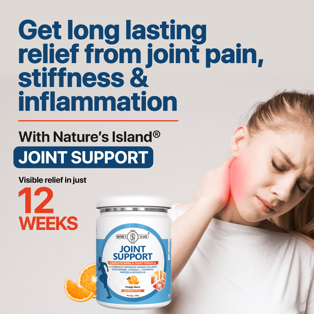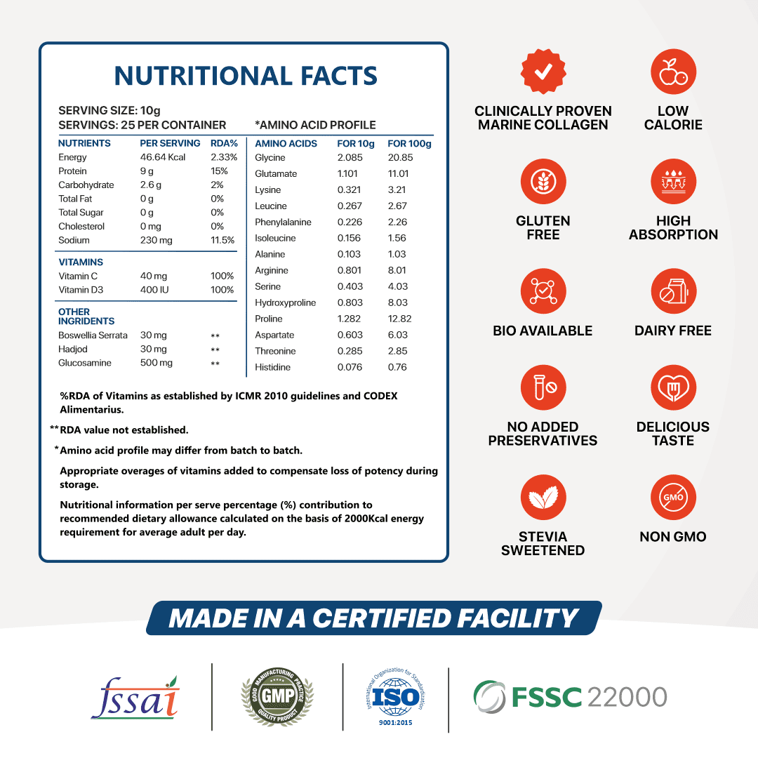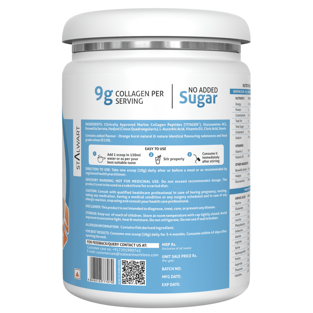 Ultimate Bone Joint Formula is a highly effective joint-care supplement developed to provide correct nourishment for healthier and stronger bones & joints. Formulated with the power of clinically proven and patented Marine Collagen Peptides (TITAGEN ®) and goodness of Glucosamine, Hadjod, Bosewelia, Vitamin D3 & Vitamin C, it helps reduce inflammation and stiffness, relieve joint pain, improve joint flexibility and overall joint function. Each serving of 10g contains 9g collagen.