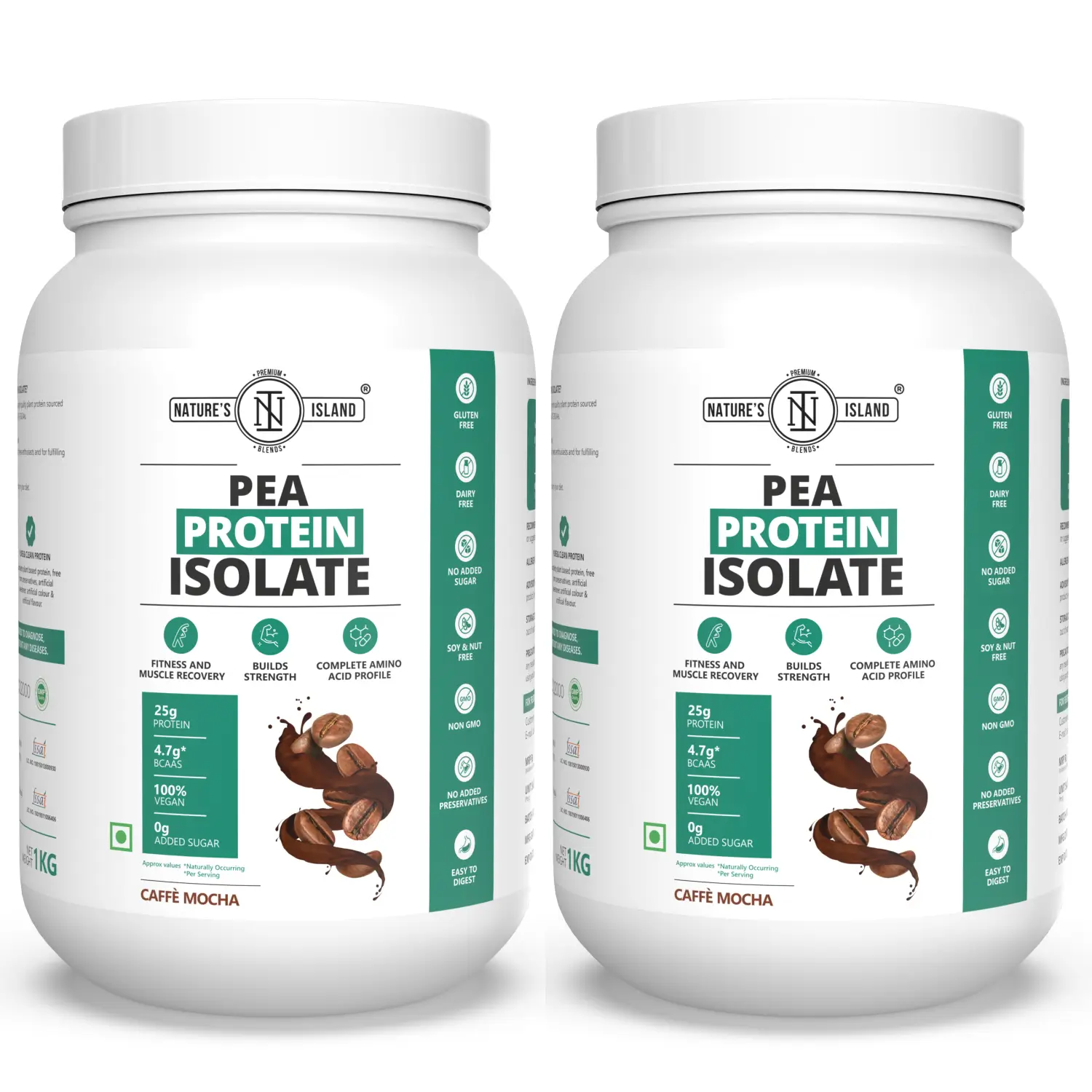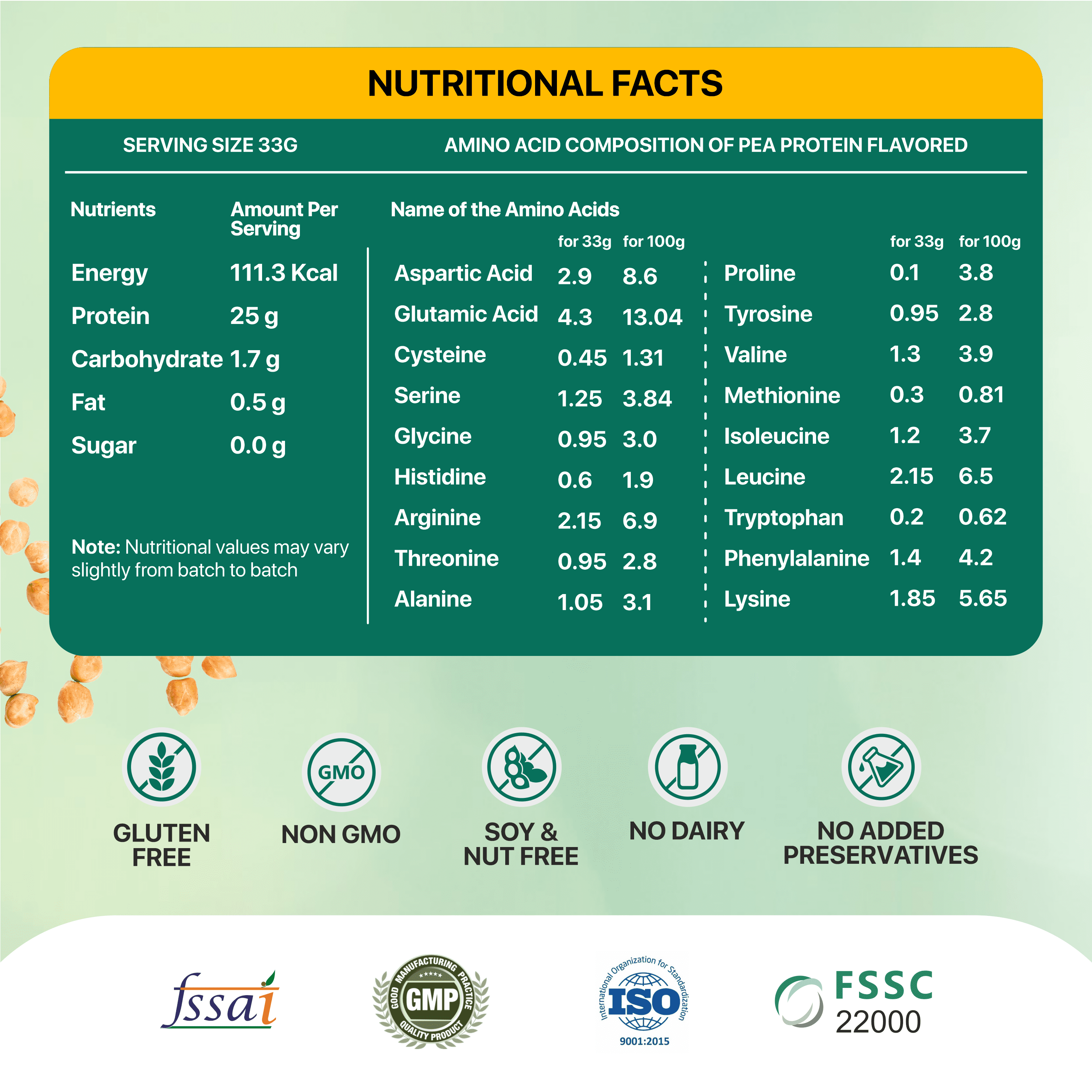 Each serving of 33g Pea Protein Isolate (Unflavoured) contains 27g protein, 5g BCAAs and ZERO added sugar. Each serving of 33g Pea Protein Isolate ( Chocolate Fudge) contains 25g protein, 4.7g BCAAs and ZERO added sugar.