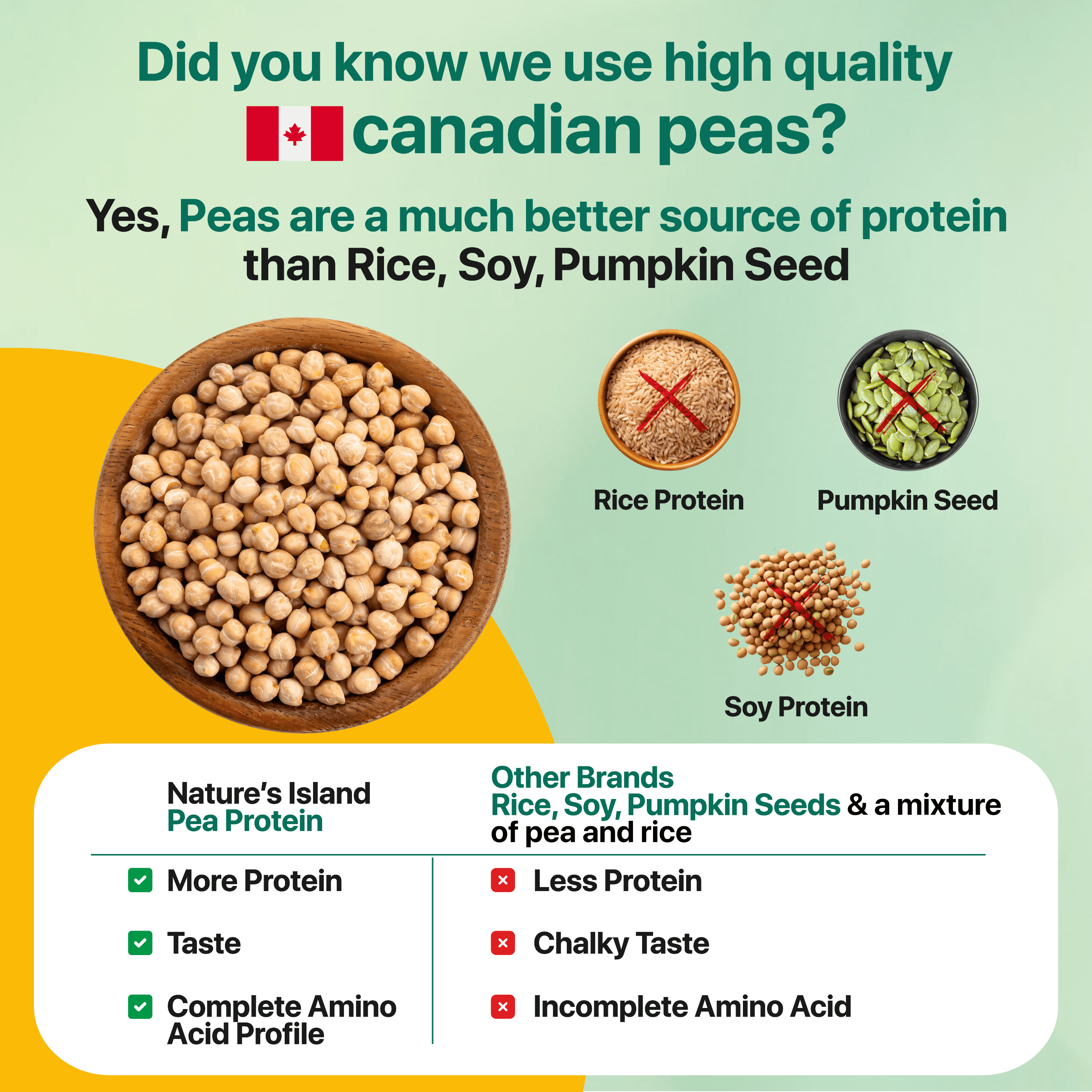 A. Our plant protein has been sourced from 100% golden Canadian Peas. We have not added any rice, soy or quinoa to this protein. Peas are a superior source of protein.